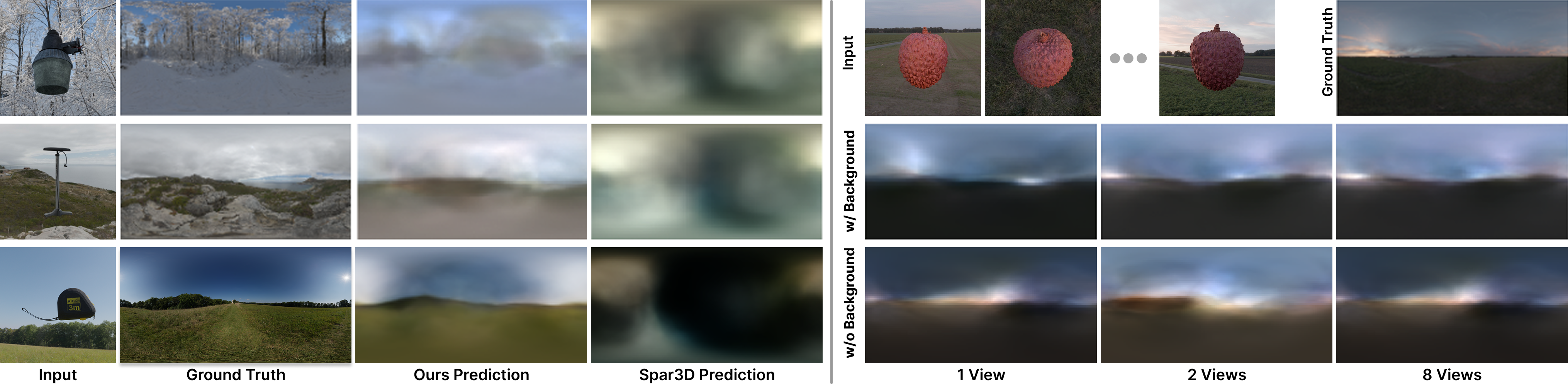 Illumination Estimation — The model recovers plausible sky color and dominant light direction even from a single view, and improves source localization when more views or background evidence are available. Compared to prior RENI++ usage, the multi-view illumination path produces sharper and more coherent environment predictions.