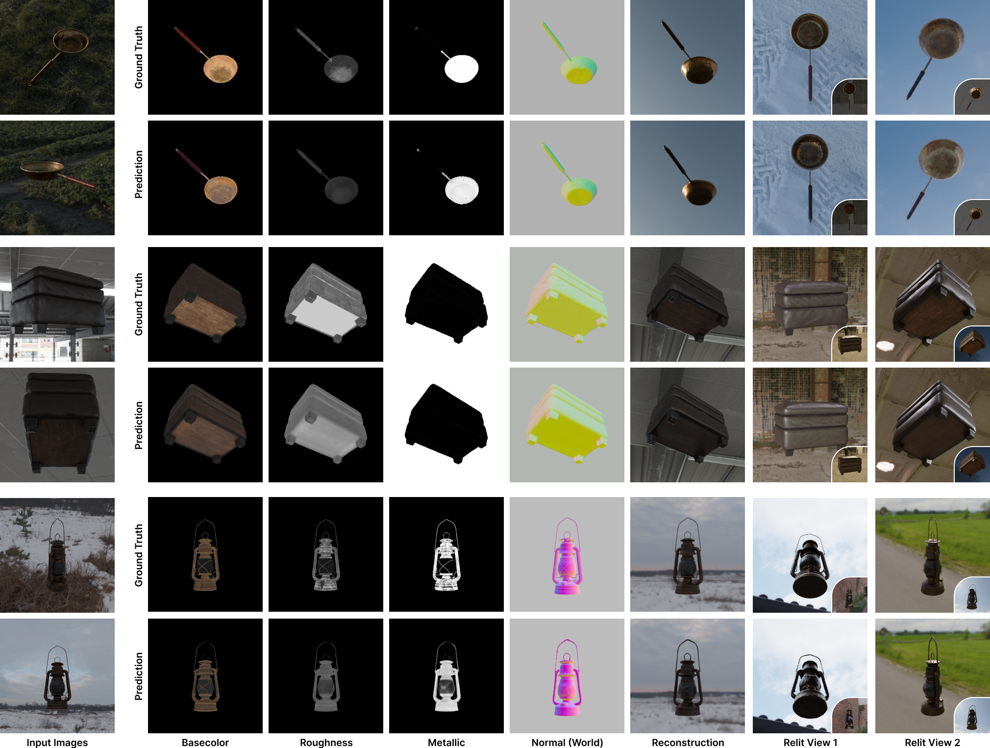 The ICLR paper focuses on disentanglement quality: ReLi3D predicts fully spatially varying PBR channels and coherent illumination, improving significantly with additional views.