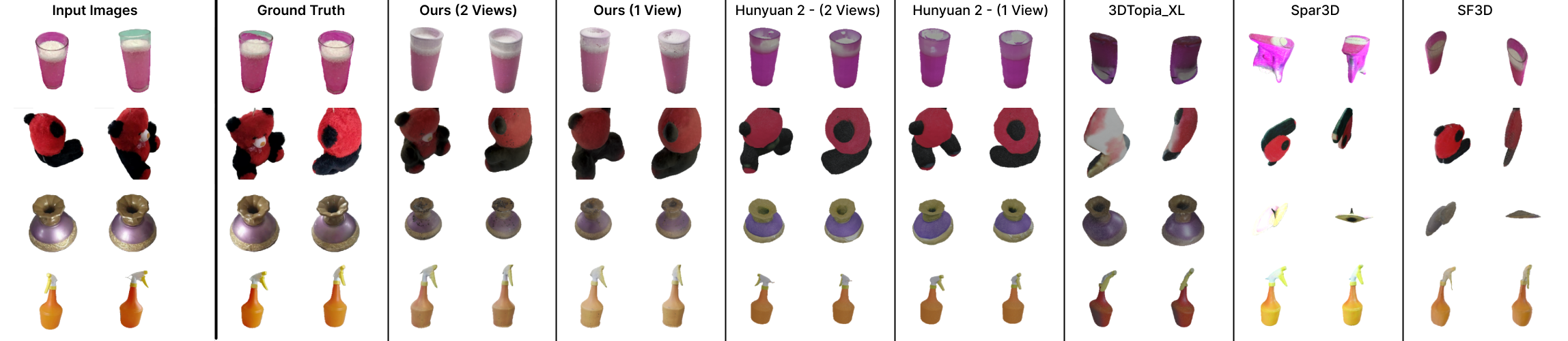 ReLi3D achieves strong reconstruction quality while staying interactive (about 0.3s per object). The paper evaluates both synthetic and real-world datasets and shows consistent gains from multi-view conditioning.